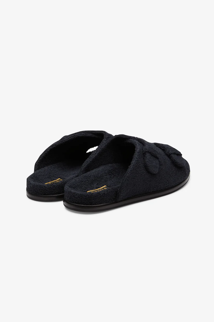 A cozy sandal perfect for summer looks. The shoe features a double velcro strap in black and a terrycloth lining, with a fussbet covered in terry matching the upper. Fastening is through a concealed velcro fastener. The outsole is made of black dyed leather and the tread is rubber.